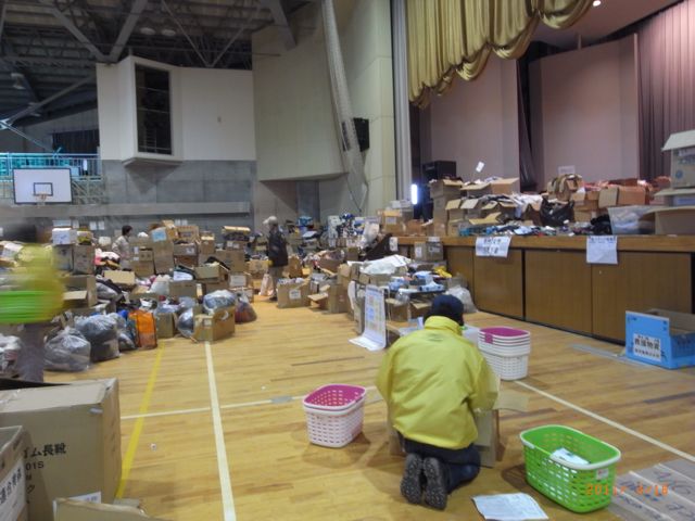 さて、16日土曜日に、女性7人で支援ボランティアに行きました。物資の仕分け作業です。なんどか体育館をのぞいていたので、そのすさまじいダンボール箱に度肝をぬかれていたのですが、いよいよその中に潜入です。