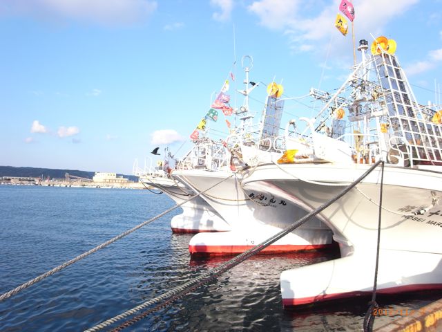 イカ釣り船だ! 大間いか釣船団 かっこいいなあ・・